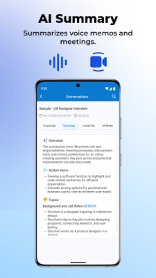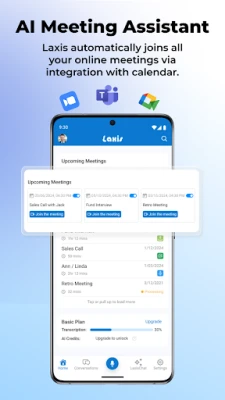Laxis yana ba ku damar yin rikodi da rubuta duk tarukan ku na fuska da fuska ba tare da wata matsala ba, yana canza kowane magana zuwa rubutu mai sauƙin bincike. Haka kuma, tare da haɗa kai da kalandarku, mataimakin AI na Laxis yana shiga kowane taro na kan layi ta atomatik, ko da Zoom ne, Google Meet, ko Teams, don haka ba za ku sake damuwa da keta taro ba. Bayan taro, Laxis yana samar da taƙaitattun bayanai na musamman da AI ta shirya, yana adana lokacinku mai daraja da kuma tabbatar da cewa ba ku rasa komai ba daga muhimman bayanai ko yarjejeniyoyi.