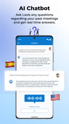 Laxis na rikodin da fassara tattaunawar tarurruka, yana samar da taƙaitattun bayanai, buƙatun abokan ciniki, da imel na biyo baya kai tsaye. Hakanan, zaka iya tambayar Laxis don amsoshi nan take daga tattaunawar baya. A takaice, Laxis yana haɓaka ingancin ku kafin, lokacin, da bayan taro.