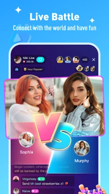 Ku shiga cikin miliyoyin masu amfani da ke aiki a Niki Live kuma ku ji daɗin haɗuwa da mutane masu ra'ayi ɗaya daga kowane lungu da saƙo na duniya. Anan, zaku iya zama magoya bayan taurarin da kuka fi so, ku yi hulɗa da su kai tsaye, har ma ku shiga faɗan PK mai ban sha'awa. Kuna da ikon tallafawa masu gabatarwa da kuka fi so, ko ma ku fafata da masu gabatarwa daga ƙasashe daban-daban don ƙwarewar nishaɗi mai ban sha'awa. Dakunan shakatawa na Niki Live suna ba ku damar haɗa kai da mutane goma sha biyu don tattaunawar murya mai inganci, yana kawo ƙarshen kaɗaici da kuma samar da yanayi mai aminci da daɗi.