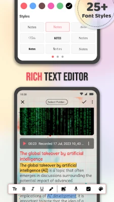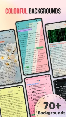 Ka bayyana kanka ta hanyar keɓance rubutunka a cikin Notes - Notepad, Notebook free note taking simple notepad app. Editan bayanan kula mai ci gaba yana ba ka damar sa rubutunka ya zama mai kauri, tsaga, ko kuma mai layi a ƙasa. Ƙara hotuna masu ɗaukar hankali ko fayilolin sauti don ba da cikakken bayani ga tunaninka. Haka kuma, za ka iya saita launuka daban-daban, masu launi biyu (gradient), grid, ko ma hotuna a bayan rubutunka don ba su kyawun gani. Don ayyukan yau da kullum, ka ƙirƙiri jerin abubuwan yi (checklists) kuma ka ja su don tsara su yadda kake so. Zabi nau'ikan rubutu daban-daban da launin rubutu don kowane bayani, duk kai tsaye daga edita.